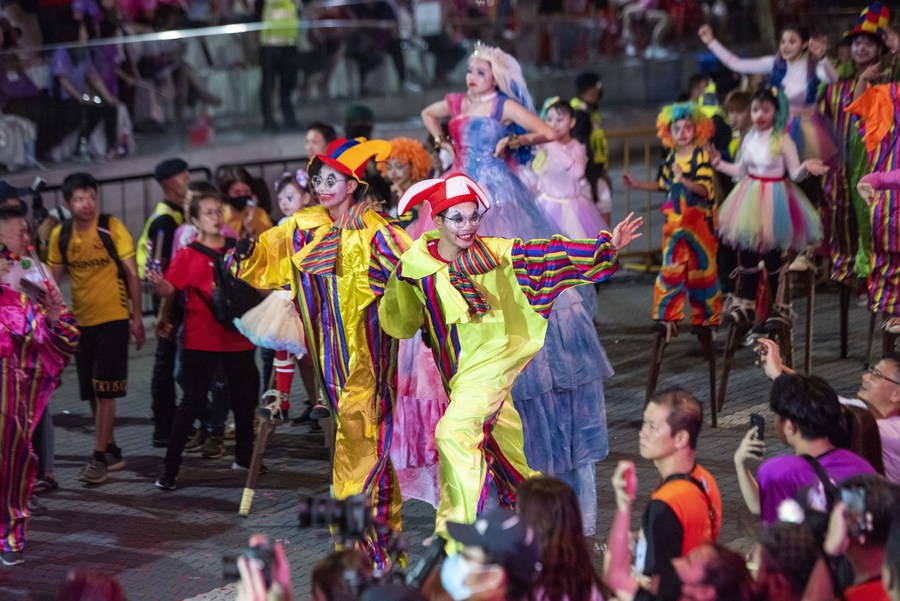 Stilts performers are pictured during the Chingay Night Parade in Johor Bahru, Malaysia on Feb. 11, 2023. (Photo by Chong Voon Chung/Xinhua)