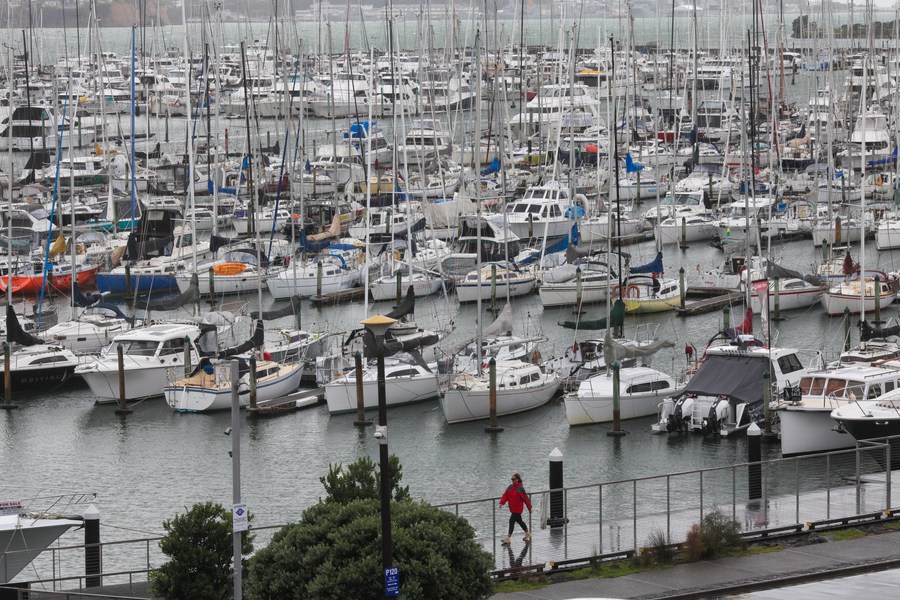 A woman walks by a marina full of yachts in Auckland, New Zealand on Feb. 12, 2023. (Photo by Zhao Gang/Xinhua)