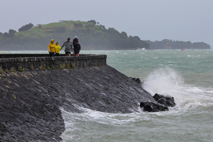 People walk by a windy seashore in Auckland, New Zealand on Feb. 12, 2023. (Photo by Zhao Gang/Xinhua)