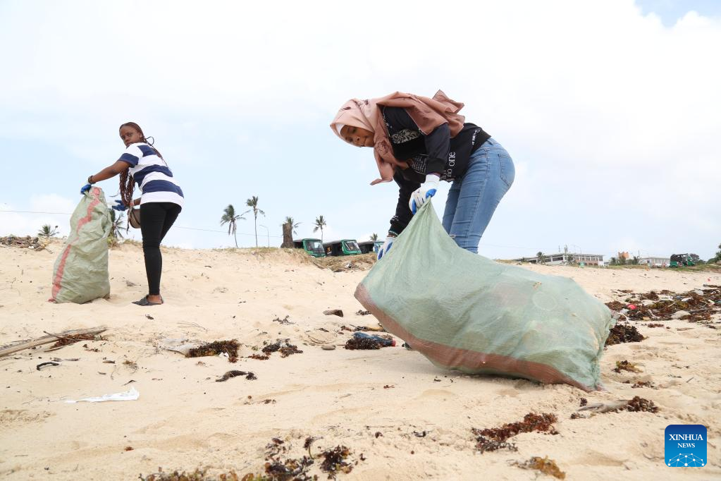 People clean up waste on a beach in Dar es Salaam, Tanzania, Feb. 7, 2023. (Photo by Herman Emmanuel/Xinhua)