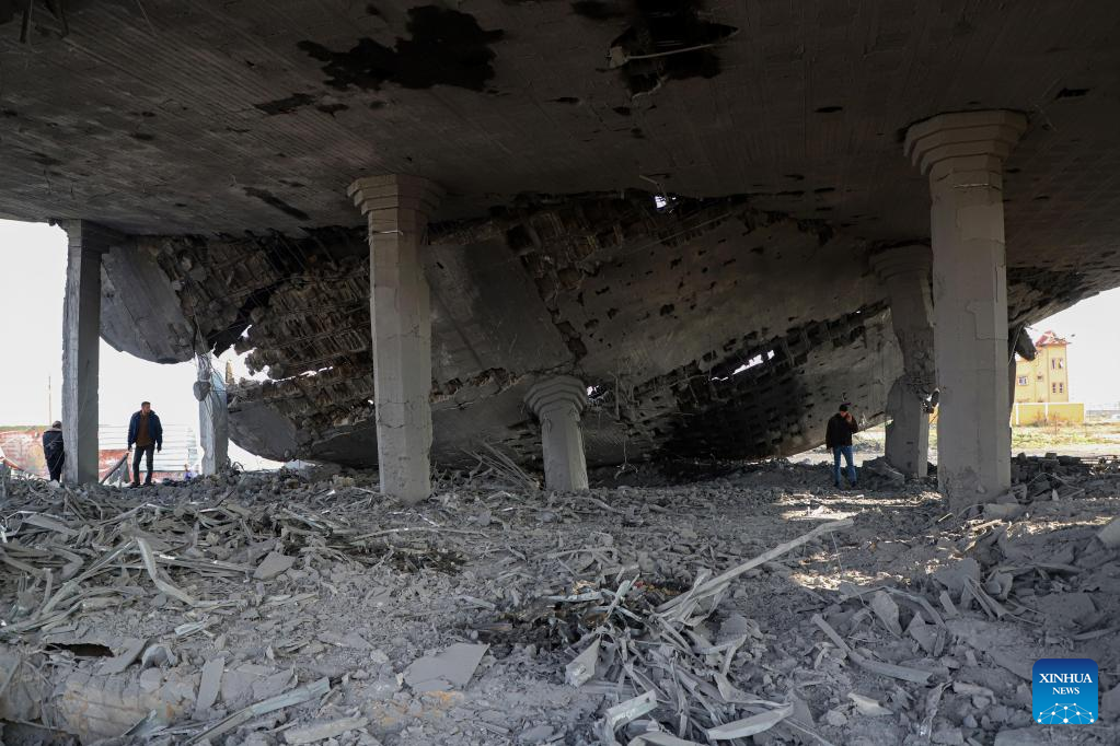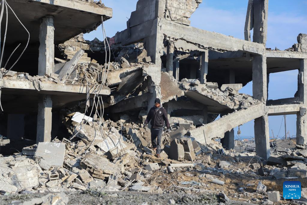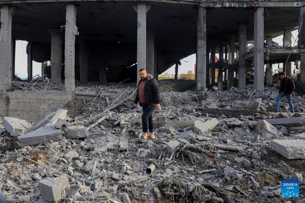 A Palestinian inspects a building destroyed in an Israeli airstrike in Gaza City, Feb. 13, 2023. (Photo by Rizek Abdeljawad/Xinhua)