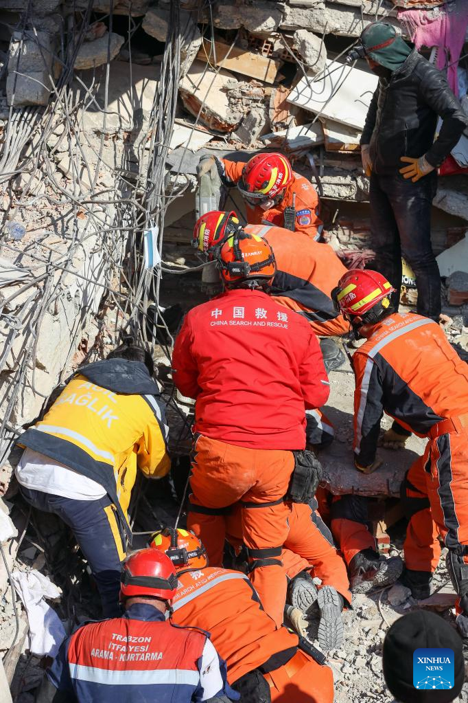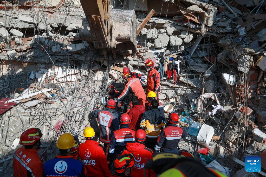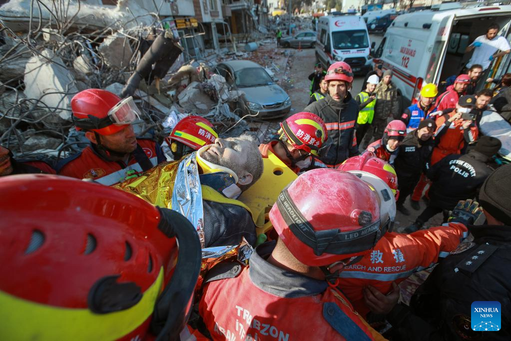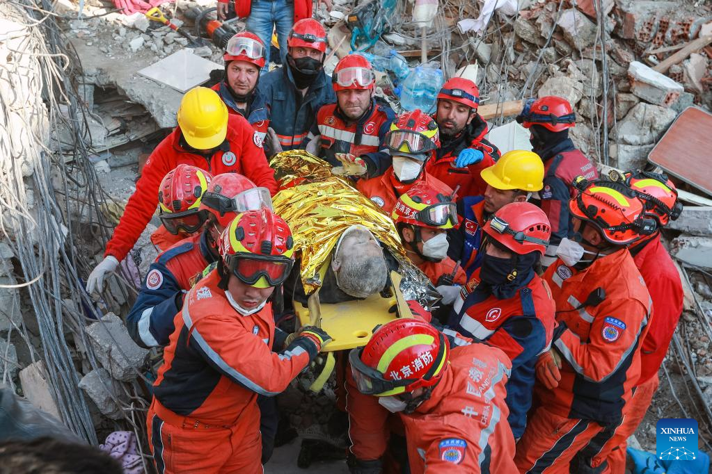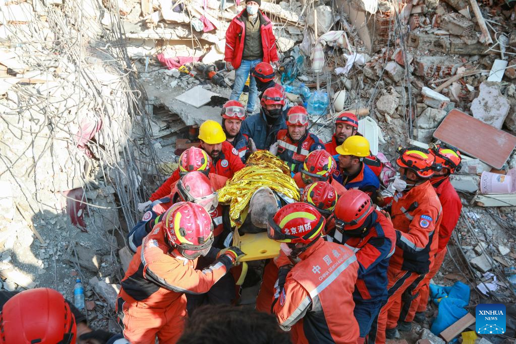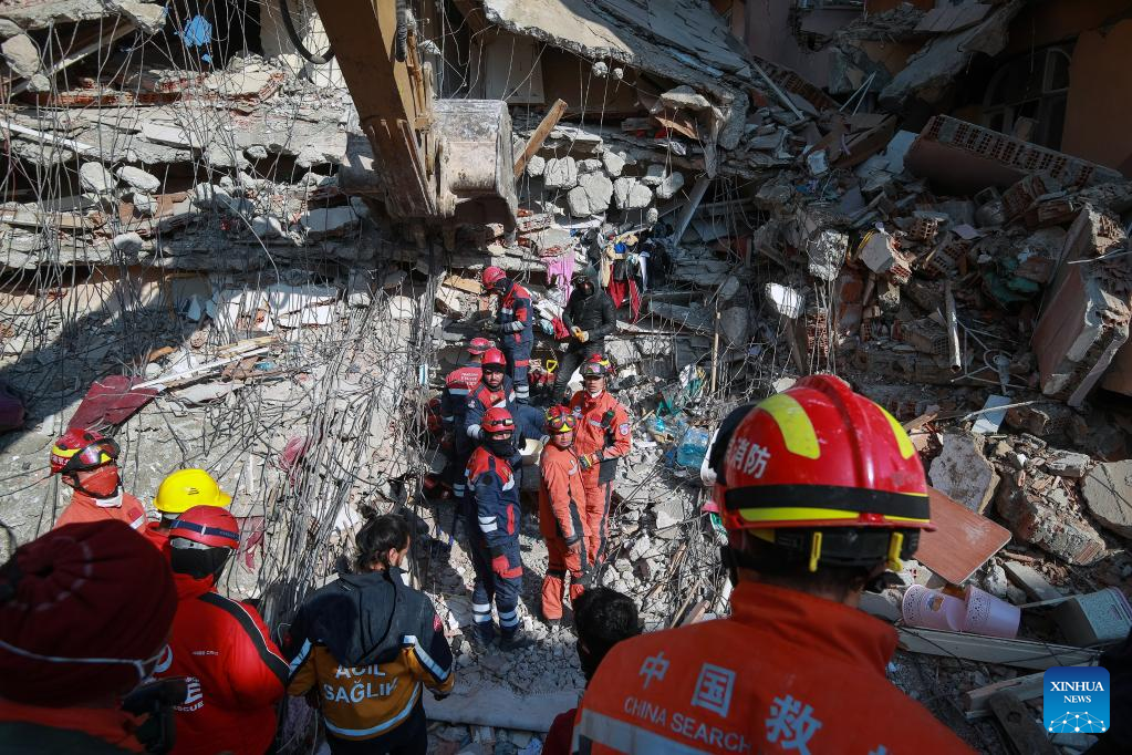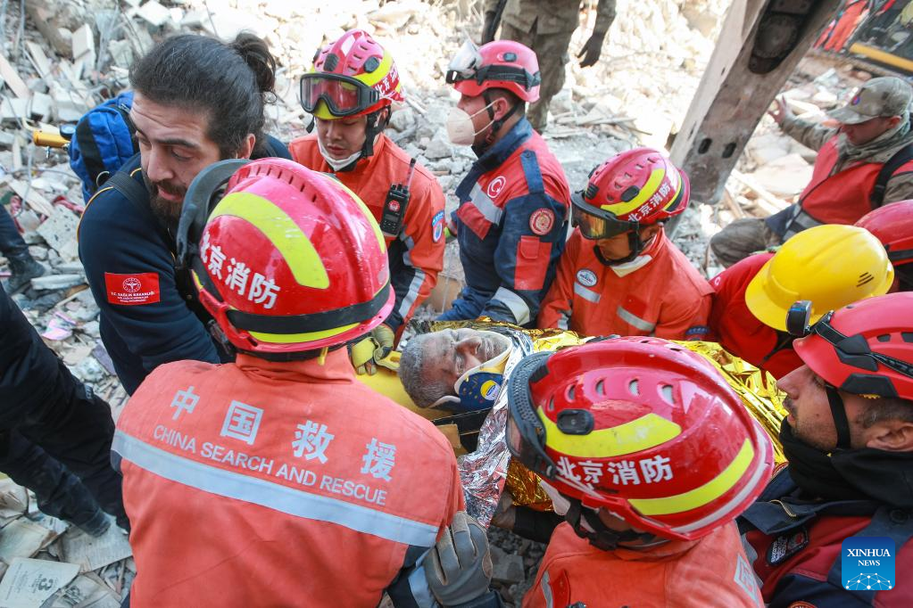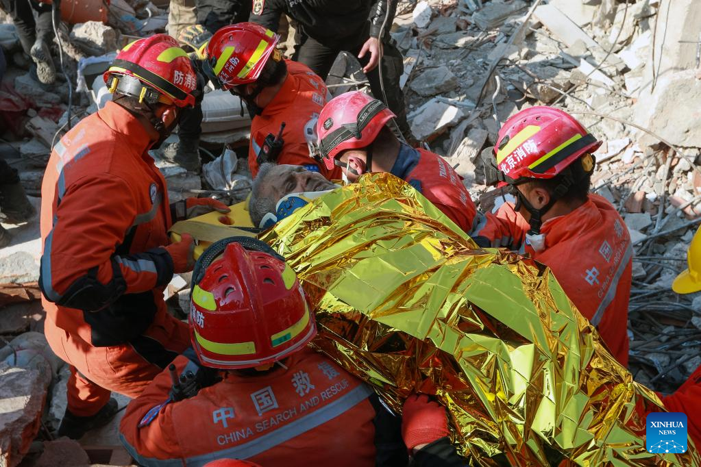 Chinese and Turkish rescuers carry out rescue operation on earthquake debris in Antakya in the southern province of Hatay, Türkiye, Feb. 12, 2023. A survivor was rescued from the debris in Antakya, Türkiye, by Chinese and local rescuers on Sunday afternoon, 150 hours after the quake hit the region. (Photo by Mustafa Kaya/Xinhua)