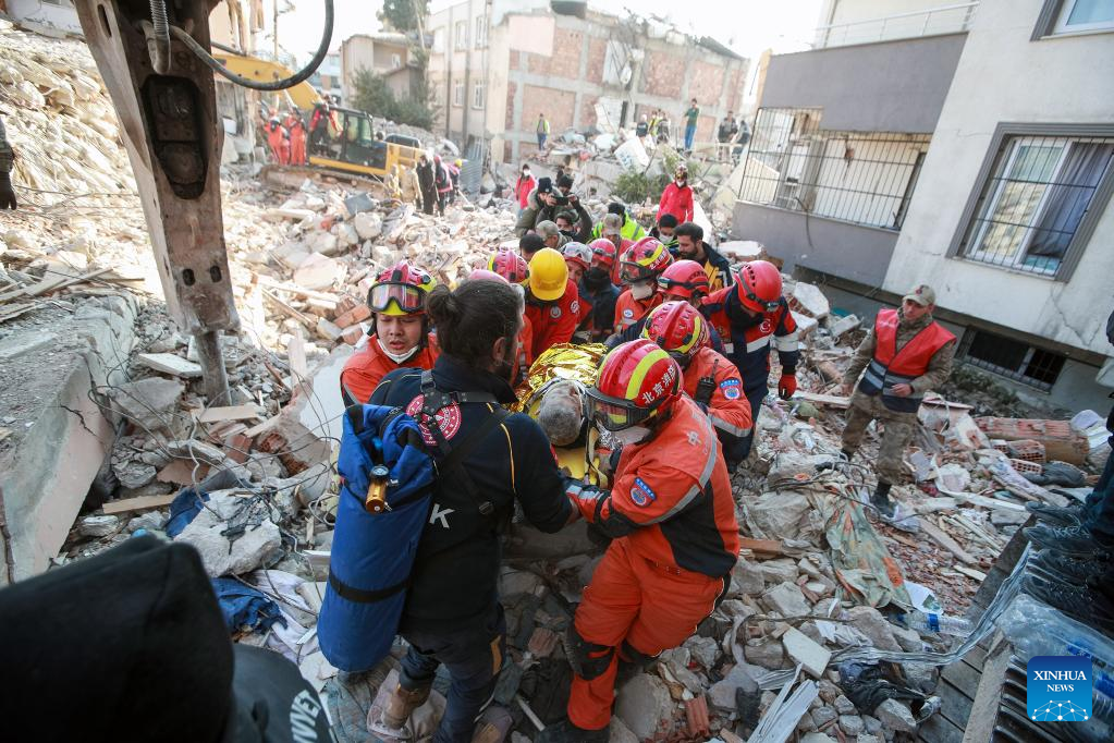 Chinese and Turkish rescuers transfer an earthquake survivor in Antakya in the southern province of Hatay, Türkiye, Feb. 12, 2023. A survivor was rescued from the debris in Antakya, Türkiye, by Chinese and local rescuers on Sunday afternoon, 150 hours after the quake hit the region. (Photo by Mustafa Kaya/Xinhua)