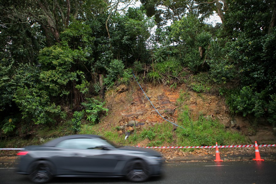 A car drives by a landslide section of the road in Auckland, New Zealand on Feb. 12, 2023. (Photo by Zhao Gang/Xinhua)