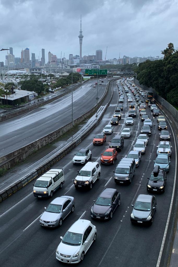 Outbound traffics on a highway in Auckland, New Zealand on Feb. 12, 2023. (Photo by Zhao Gang/Xinhua)