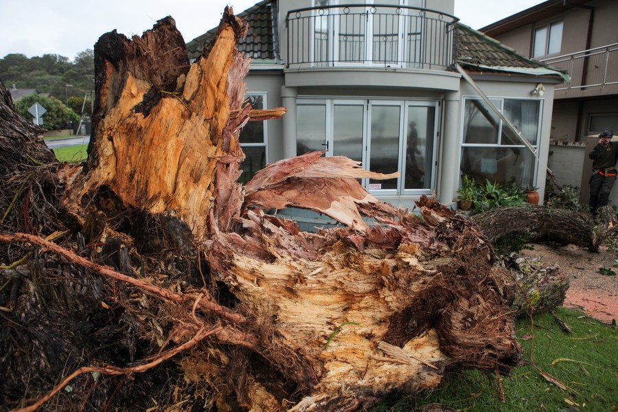 A tree is blown down by a cyclone in Auckland, New Zealand, Feb. 13, 2023. (Photo by Zhao Gang/Xinhua)