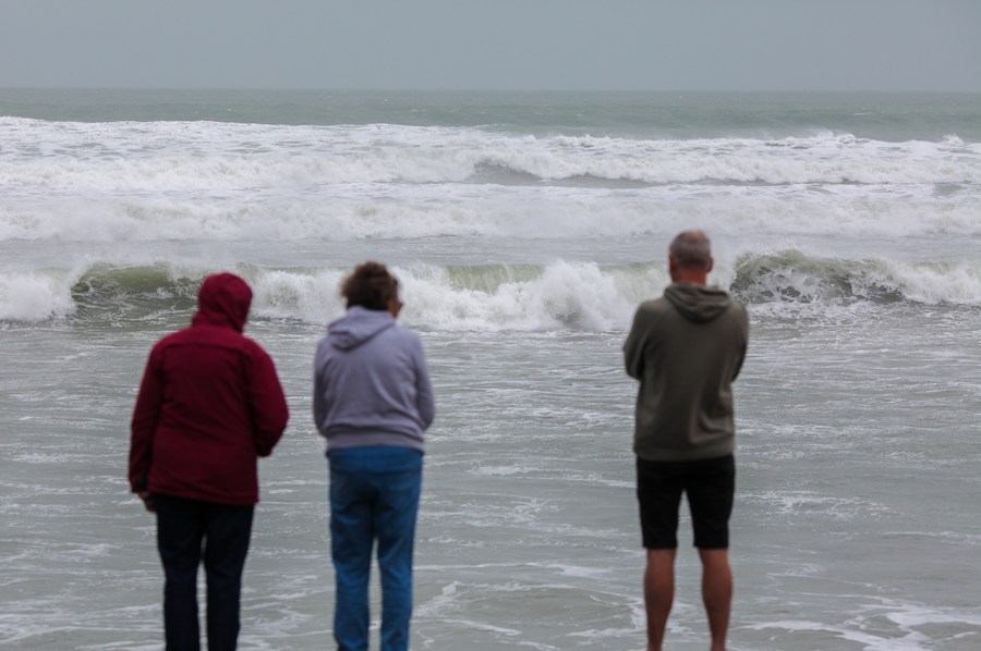 People watch tides in Auckland, New Zealand, Feb. 13, 2023. (Photo by Zhao Gang/Xinhua)