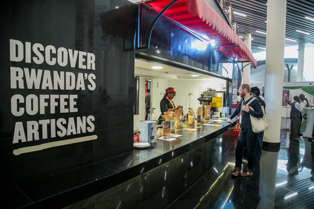 The file photo shows visitors purchasing Rwandan coffee at an exhibition stand during the 17th African Fine Coffee Conference and Exhibition in Kigali, Rwanda, Feb. 14, 2019. (Xinhua/Cyril Ndegeya)
