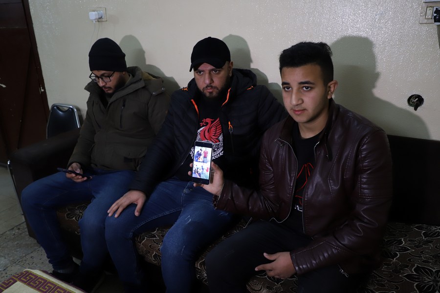 A man displays the photos of his brother who died in the earthquake of Türkiy on his mobile phone in Jabalia refugee camp in the northern Gaza Strip, on Feb. 8, 2023. (Photo by Rizek Abdeljawad/Xinhua)