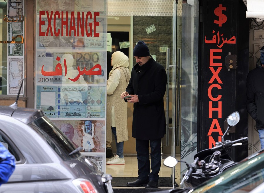 A man counts money at the entrance of a currency exchange shop along Hamara Street in Beirut, Lebanon, Jan. 14, 2023. The national currency has lost more than 96 percent of its value over three years. (Xinhua/Liu Zongya)