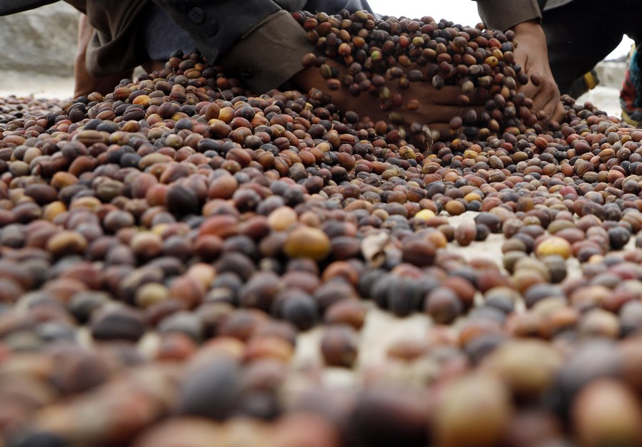A Yemeni farmer dries coffee beans under the sun at the Bani al-Nahmy village of the Manakhah district, about 100 km west of the Yemeni capital Sanaa, on Feb. 8, 2023. (Photo by Mohammed Mohammed/Xinhua)