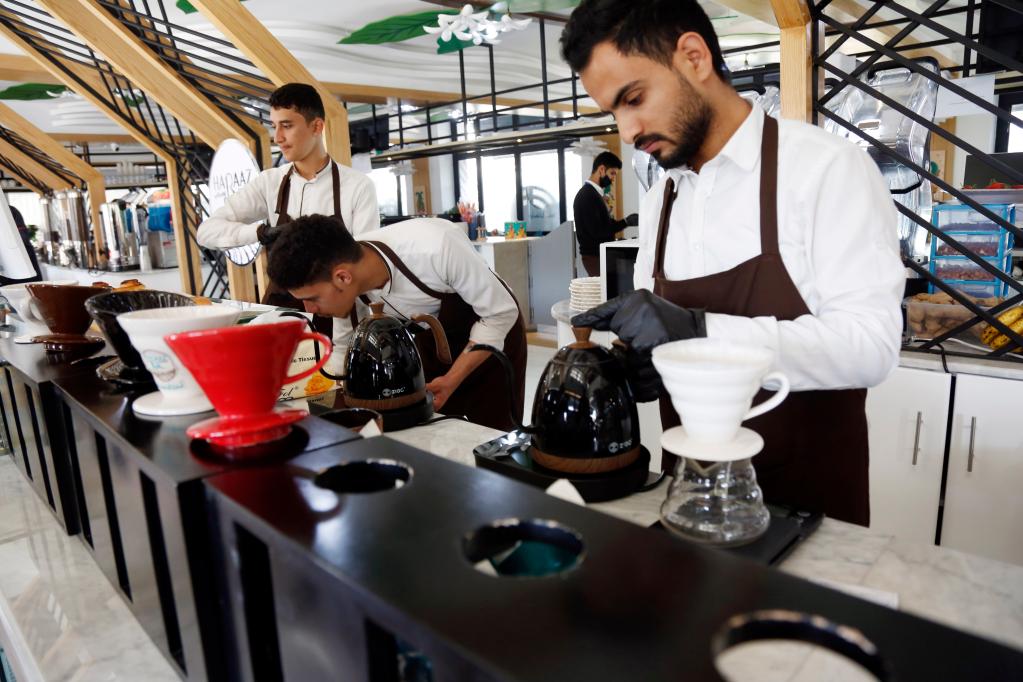 Staff at a cafe in Sanaa, Yemen's capital, brew Yemeni coffee for customers on Feb. 8, 2023. (Photo by Mohammed Mohammed/Xinhua)