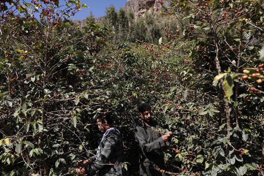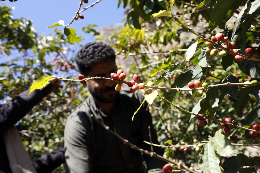 Yemeni farmers pick coffee beans at the Bani al-Nahmy village of the Manakhah district, about 100 km west of the Yemeni capital Sanaa, on Feb. 8, 2023. (Photo by Mohammed Mohammed/Xinhua)
