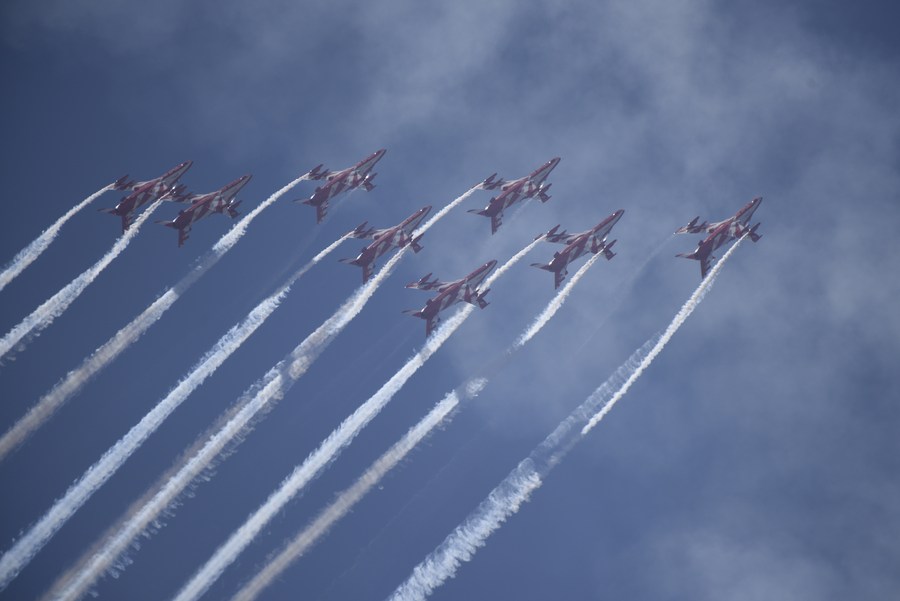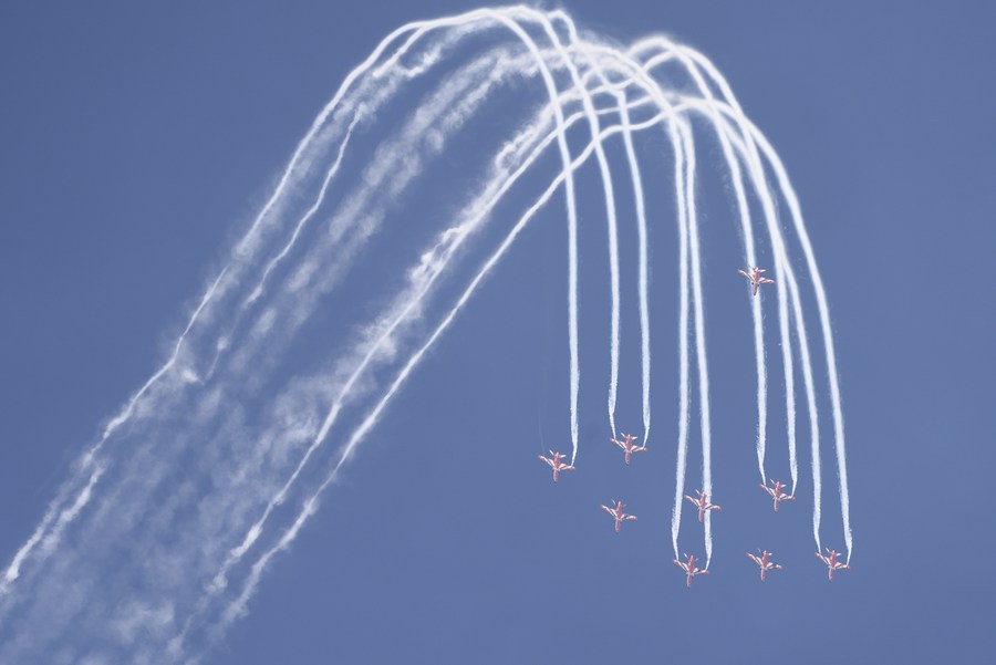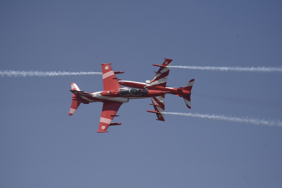 Indian Air Force's aerobatic team Suryakiran perform maneuvers at the Aero India 2023 at Yelahanka air base, in Bangalore, India, Feb. 14, 2023. (Xinhua/Stringer)