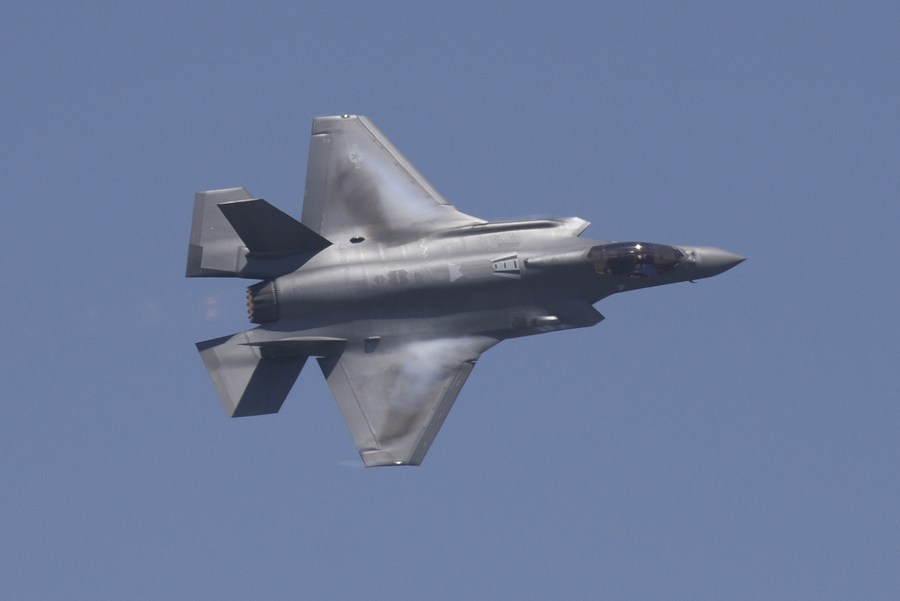 U.S. Air Force fighter aircraft F-35 performs aerobatic maneuvers at the Aero India 2023 at Yelahanka air base, in Bangalore, India, Feb. 14, 2023. (Xinhua/Stringer)