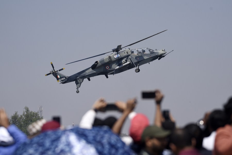 Indian Air Force indigenous light combat helicopter performs aerobatic maneuvers at the Aero India 2023 at Yelahanka air base, in Bangalore, India, Feb. 14, 2023. (Xinhua/Stringer) ■