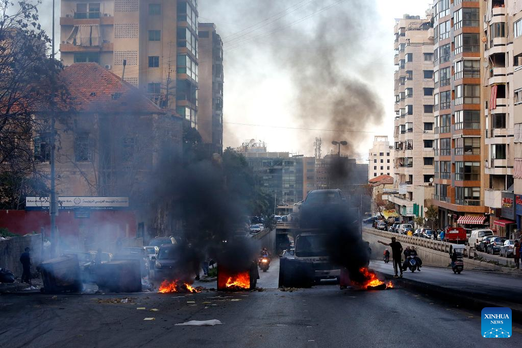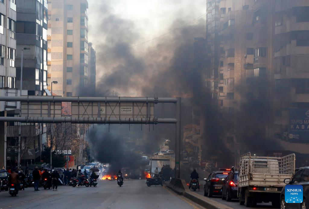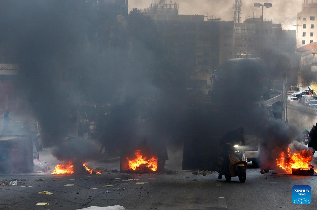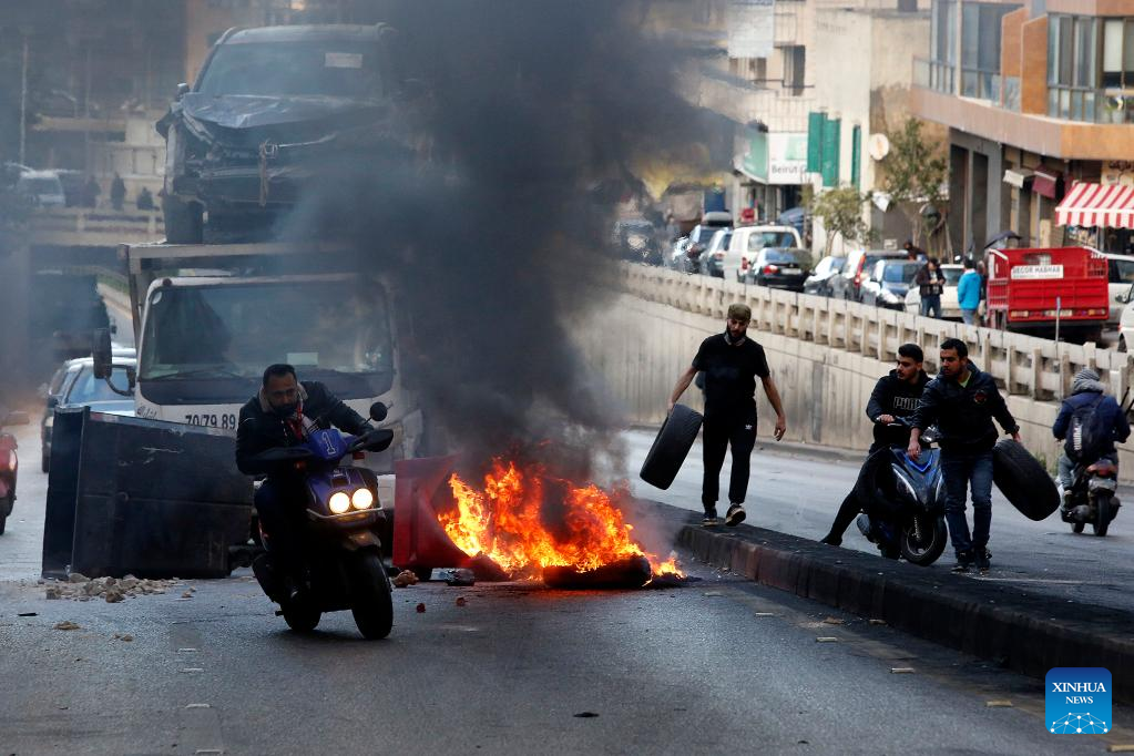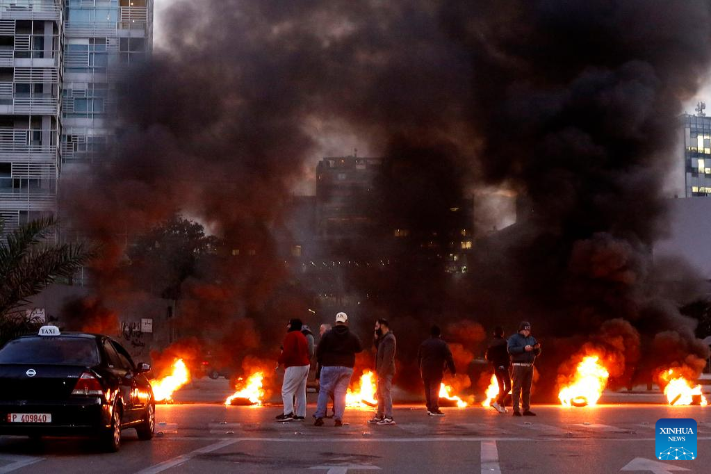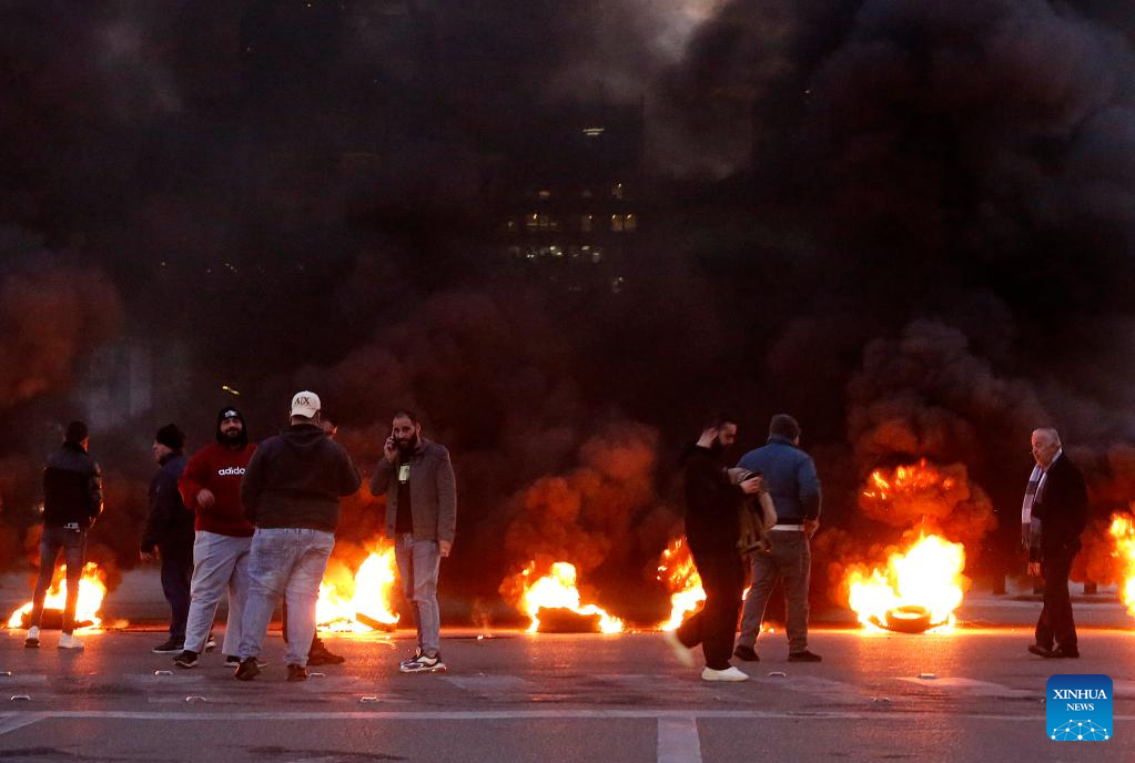 (230216) -- BEIRUT, Feb. 16, 2023 (Xinhua) -- People block a road with burning tires during a protest in Beirut, Lebanon, on Feb. 16, 2023. The Lebanese currency dropped to an all-time low on the parallel market on Wednesday, hitting 77,000 pounds per U.S. dollar. Demonstrators closed roads across Lebanon, calling for stabilized prices and improved living standards, resulting in severe traffic jams. (Xinhua/Bilal Jawich)