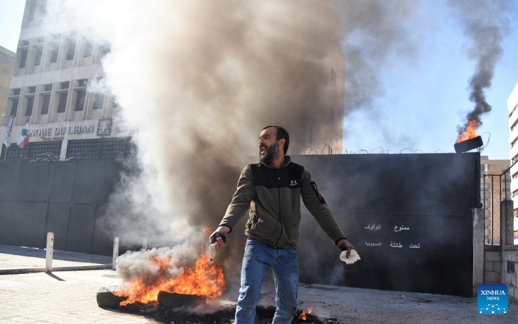 A man takes part in a protest outside a bank in Tripoli, Lebanon, on Feb. 16, 2023. The Lebanese currency dropped to an all-time low on the parallel market on Wednesday, hitting 77,000 pounds per U.S. dollar. Demonstrators closed roads across Lebanon, calling for stabilized prices and improved living standards, resulting in severe traffic jams. (Photo by Khaled Habashiti/Xinhua)