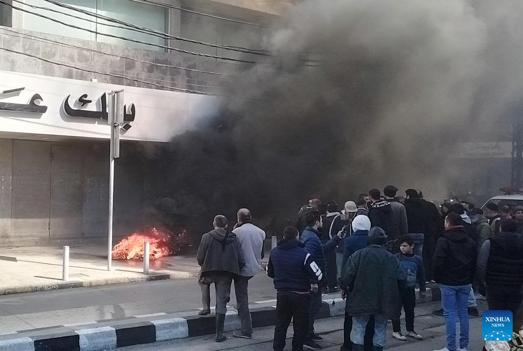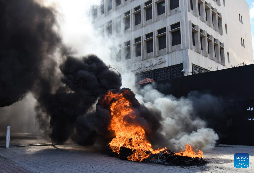 Burning tires are seen in front of a bank during a protest in Tripoli, Lebanon, on Feb. 16, 2023. The Lebanese currency dropped to an all-time low on the parallel market on Wednesday, hitting 77,000 pounds per U.S. dollar. Demonstrators closed roads across Lebanon, calling for stabilized prices and improved living standards, resulting in severe traffic jams. (Photo by Khaled Habashiti/Xinhua)
