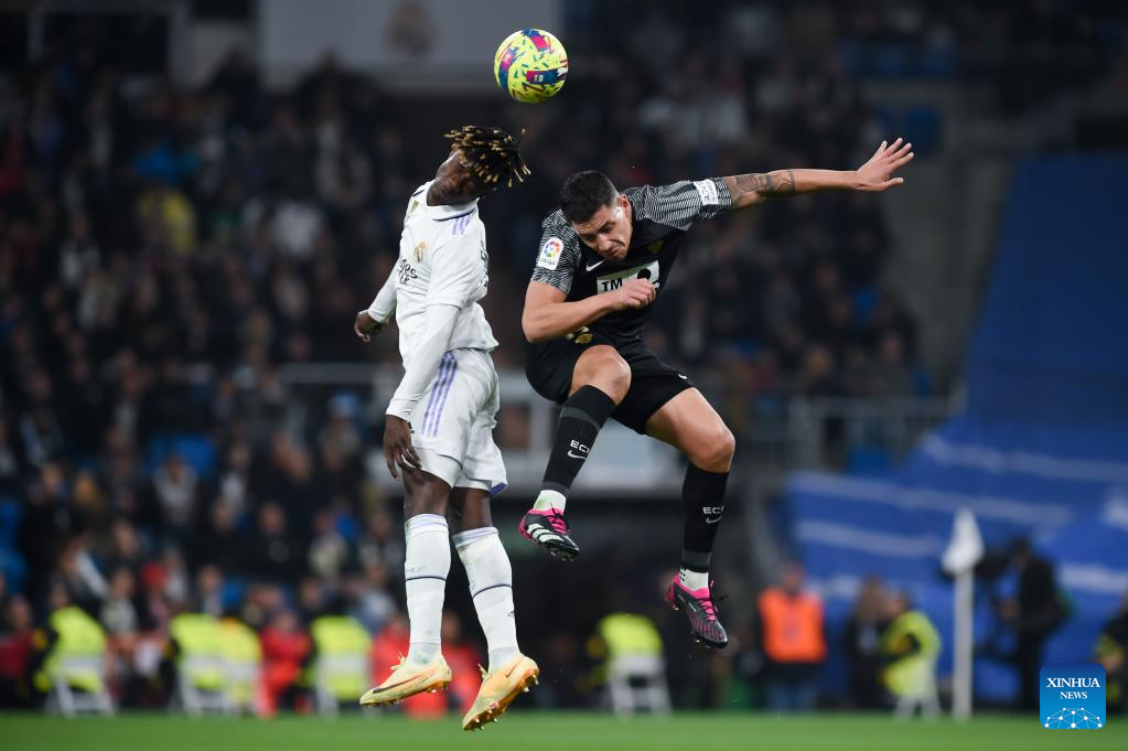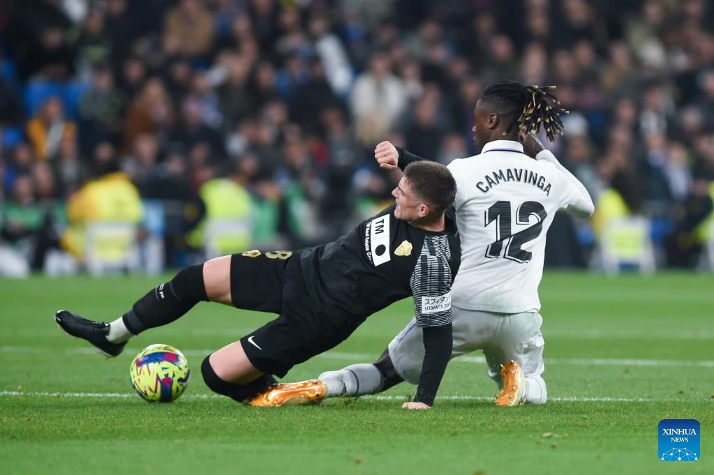 Eduardo Camavinga (R) of Real Madrid vies with Randy Nteka of Elche during a Spanish La Liga football match between Real Madrid and Elche CF in Madrid, Spain, Feb. 15, 2023. (Photo by Gustavo Valiente/Xinhua)