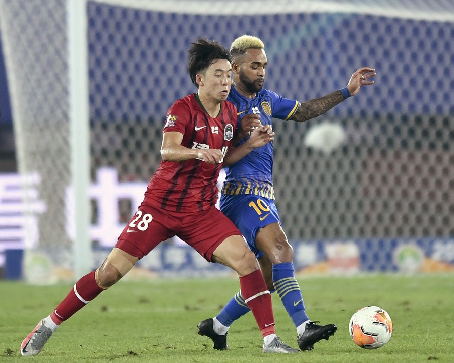 Ma Xingyu of Henan vies with Alex Teixeira (R) of Jiangsu Suning during the 8th round match at the postponed 2020 season of Chinese Football Association Super League (CSL) Dalian Division in Dalian, northeast China's Liaoning Province, Aug. 30, 2020. (Xinhua/Long Lei)