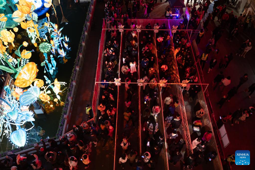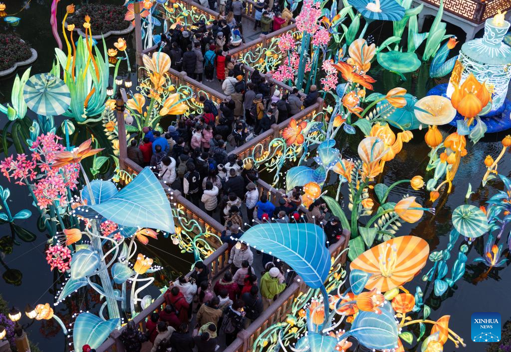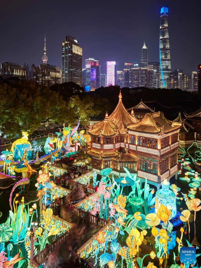 People watch a lantern show at Yu Garden in east China's Shanghai, Feb. 15, 2023. The lantern show lasted from Dec. 26, 2022 to Feb. 15, 2023, which attracted about four million visitors. (Xinhua/Jin Liwang)