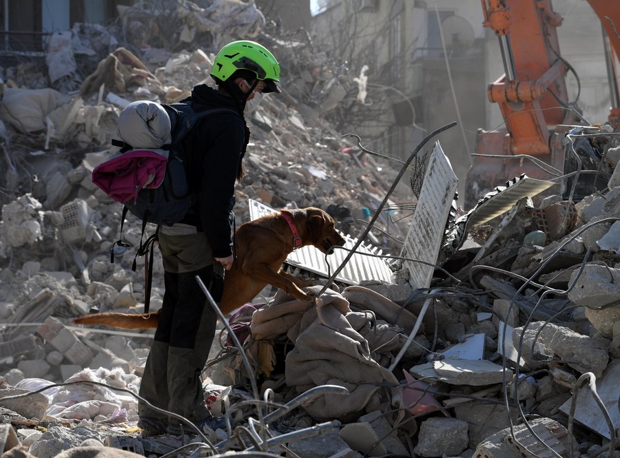 A joint rescue group encompassing members of China Search and Rescue Team and a search and rescue team from the Hong Kong Special Administrative Region (HKSAR) carry out rescue operation among earthquake debris in Antakya, southern province of Hatay, Türkiye, Feb. 14, 2023. (Xinhua/Shadati)