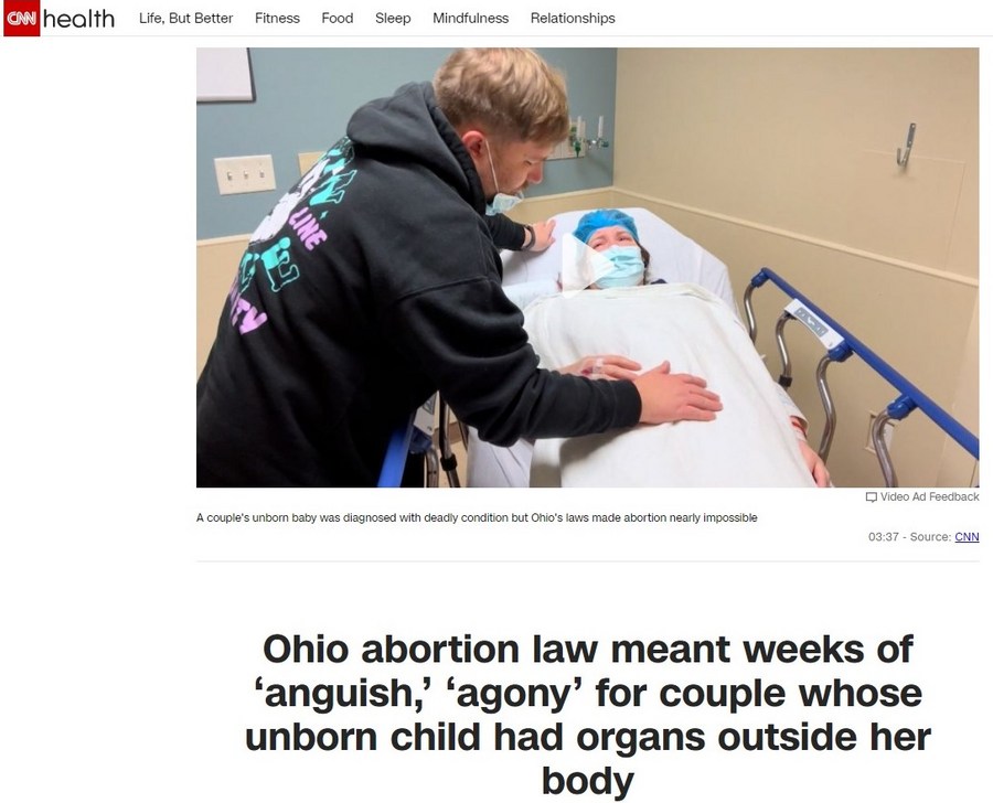 The screenshot taken from CNN's website on Feb. 15, 2023 shows the picture and title of its recent report on the anguish and agony of the Ohio couple Beth and Kyle Long who couldn't have their baby born and had to have abortion in another state. (Xinhua)