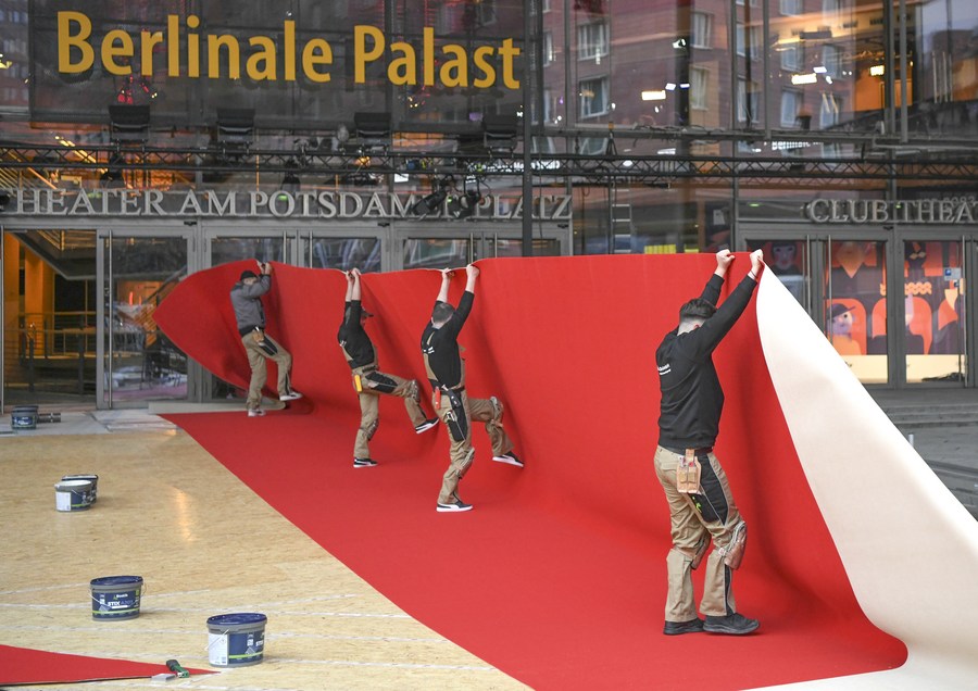 Workers install red carpets in front of Berlinale Palast in Berlin, Germany, Feb. 14, 2023. The 73rd Berlin International Film Festival will be held from Feb. 16 to 26. (Xinhua/Ren Pengfei)