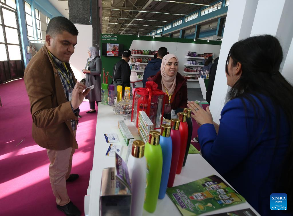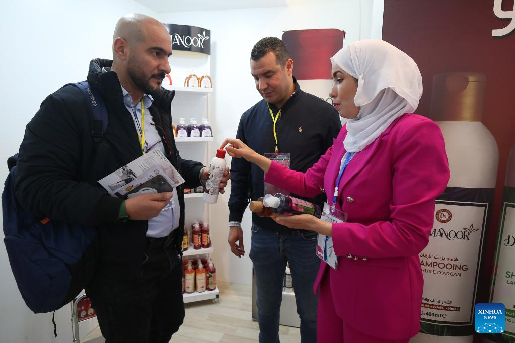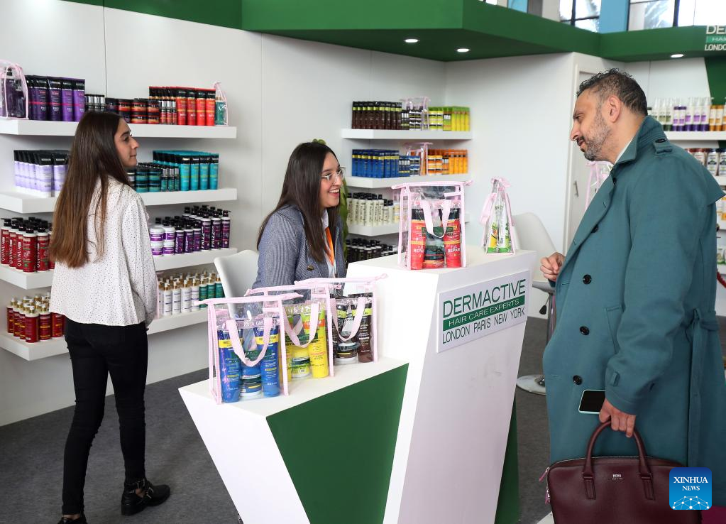 People visit the International Cosmetic Exhibition in Algiers, Algeria, on Feb. 16, 2023. This exhibition is held from Feb. 15 to Feb. 18. (Xinhua)