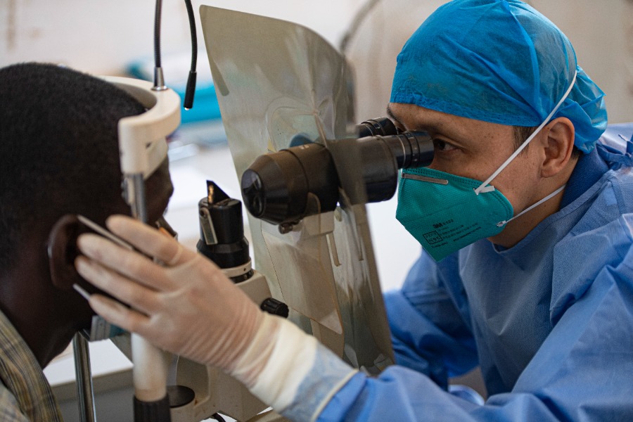 Zhang Youmei, a member of the 19th Chinese medical team dispatched to the Central African Republic, examines a patient at the Hospital of Friendship in Bangui, Central African Republic, Feb. 13, 2023. (Xinhua/Li Yahui)