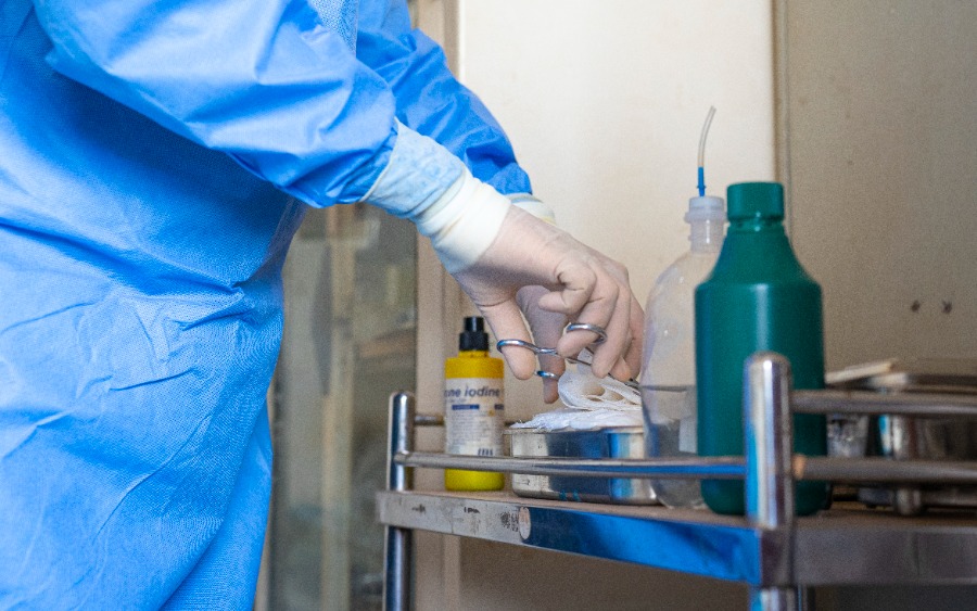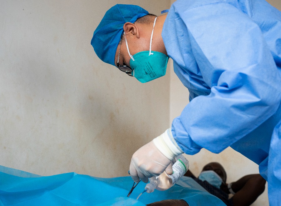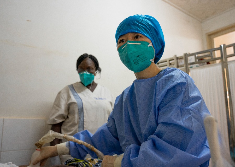 Xu Yan, a member of the 19th Chinese medical team dispatched to the Central African Republic, change a wound dressing for a patient at a hospital in Bangui, Central African Republic, Feb. 13, 2023. (Xinhua/Li Yahui)