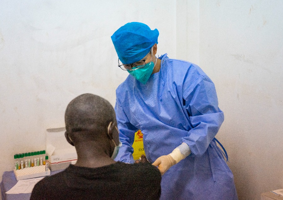 Guo Jianwei, a member of the 19th Chinese medical team dispatched to the Central African Republic, takes blood samples from a patient for examination at the Hospital of Friendship in Bangui, Central African Republic, Feb. 13, 2023. (Xinhua/Li Yahui)