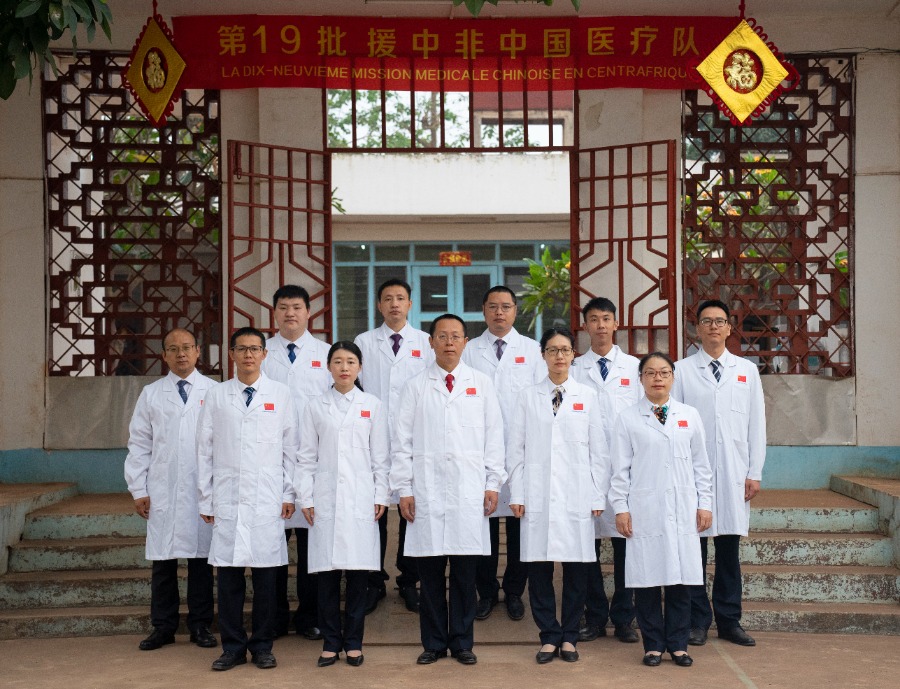 Members of the 19th Chinese medical team dispatched to the Central African Republic pose for a group photo in Bangui, Central African Republic, Feb. 14, 2023. (Xinhua/Li Yahui)