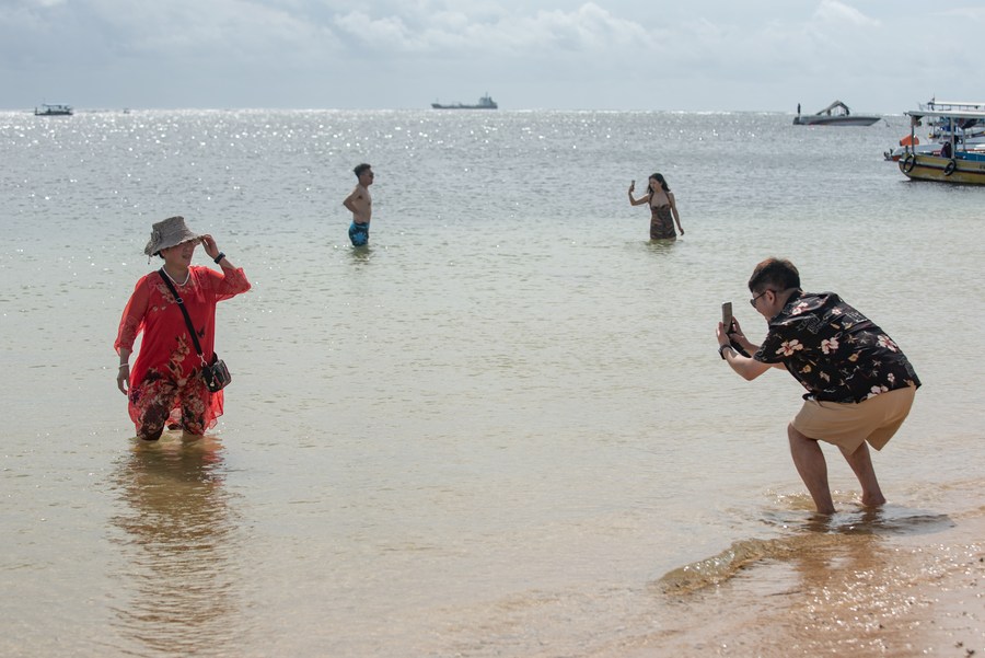 Chinese tourists take pictures on Tanjung Benoa beach in Bali, Indonesia on Feb. 13, 2023. (Photo by Dicky Bisinglasi/Xinhua)