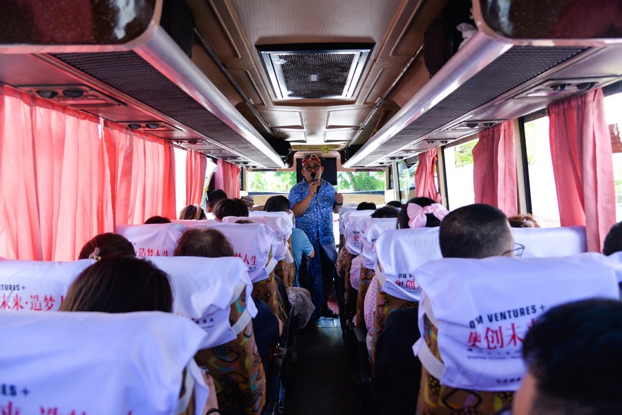 A local tour guide (C) talks to Chinese tourists on a bus departing from the Bali Denpasar Ngurah Rai International Airport to a hotel in Bali, Indonesia on Feb. 12, 2023. (Xinhua/Xu Qin)■