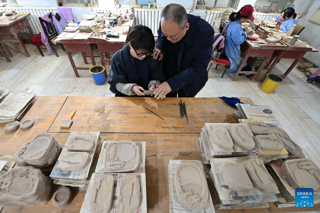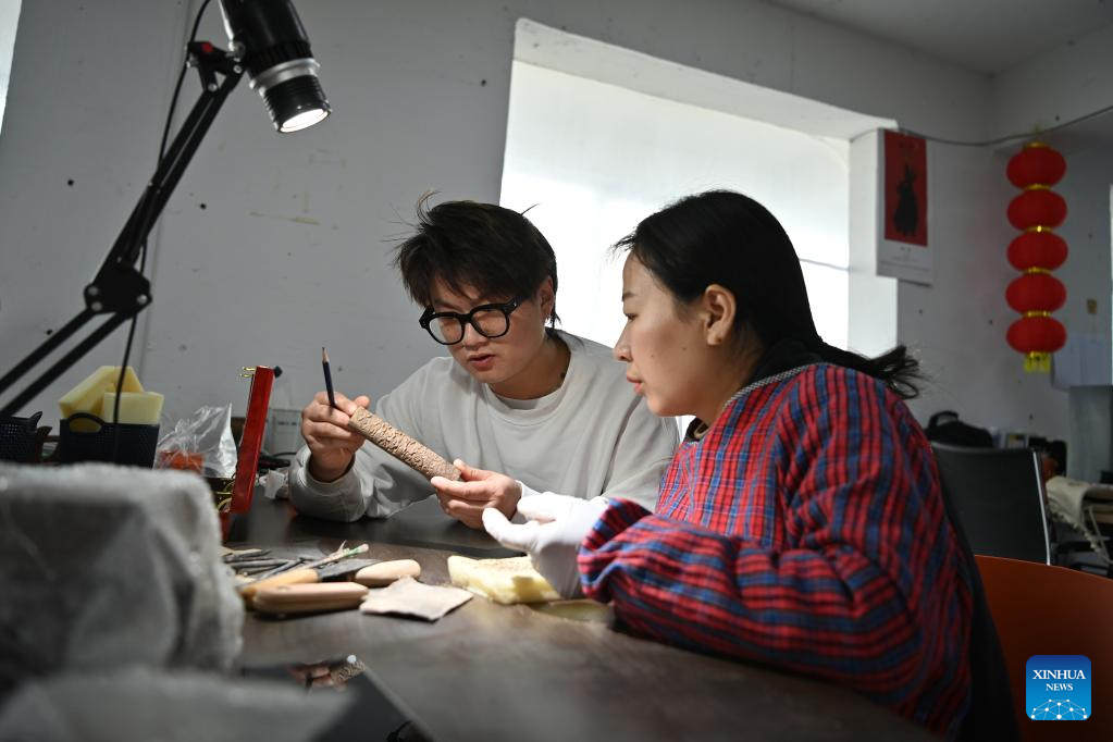Lin Tao (L), a representative inheritor of the craft of making Chengni inkstone at the provincial level, guides his son Lin Xiaolin on the details of carving on Chengni inkstone in Guangcun Village of Xinjiang County in Yuncheng, north China's Shanxi Province, Feb. 14, 2023.