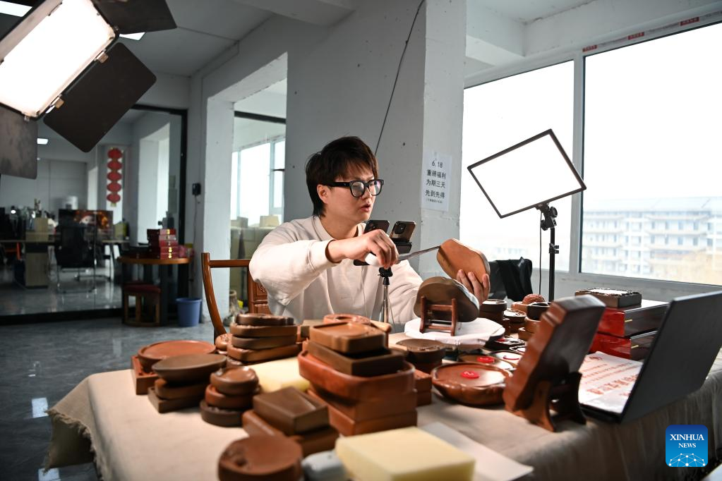 Lin Xiaolin presents Chengni inkstones via live streaming in a studio in Xinjiang County of Yuncheng, north China's Shanxi Province, Feb. 15, 2023.