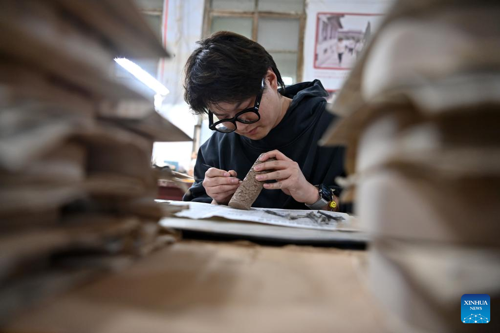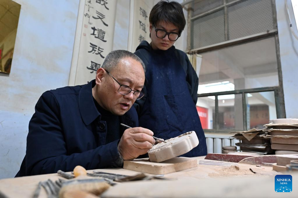 Lin Xiaolin carves on a Chengni inkstone in Guangcun Village of Xinjiang County in Yuncheng, north China's Shanxi Province, Feb. 14, 2023.