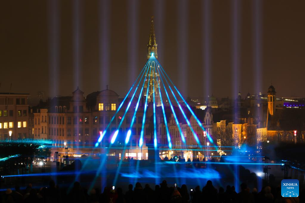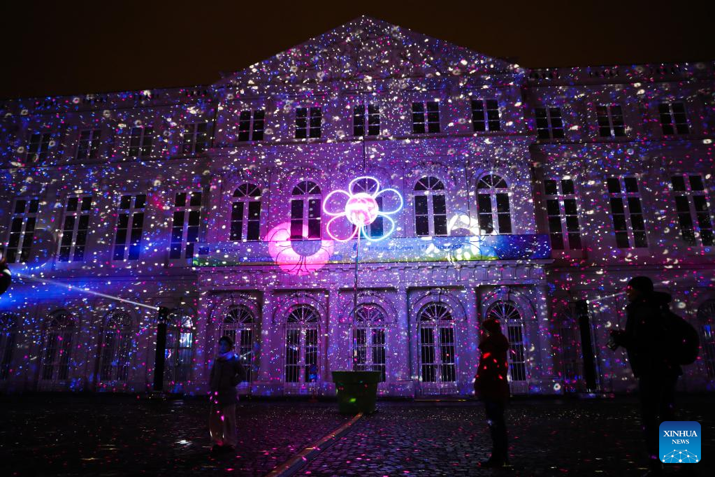 A light show is seen during the Bright Festival, the Brussels Festival of Light, in Brussels, Belgium, Feb. 16, 2023. Some twenty artistic light installations were set up to decorate the capital of Belgium during the festival, which is to be held from Feb. 16 to 19. (Xinhua/Zheng Huansong)
