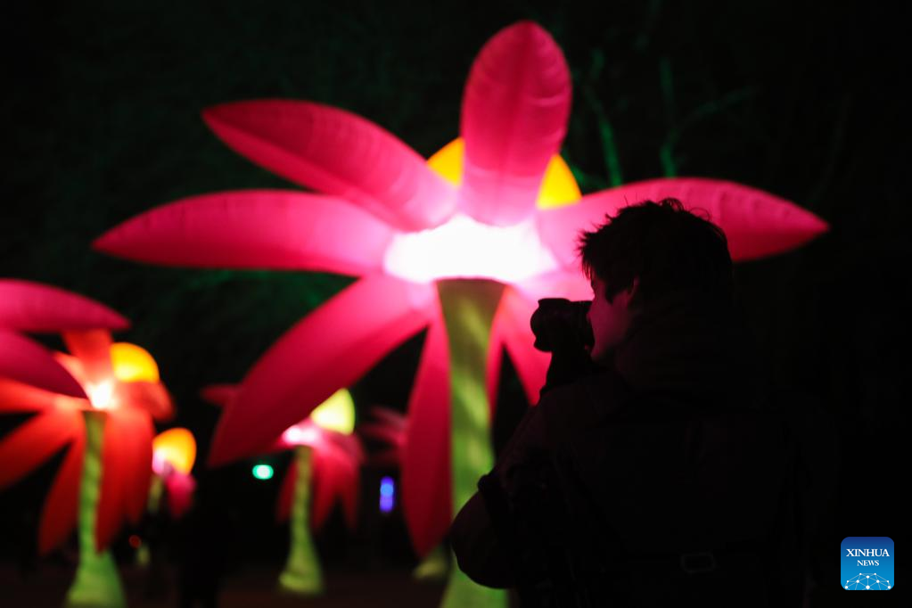 A man takes photos of light installations during the Bright Festival, the Brussels Festival of Light, in Brussels, Belgium, Feb. 16, 2023. Some twenty artistic light installations were set up to decorate the capital of Belgium during the festival, which is to be held from Feb. 16 to 19. (Xinhua/Zheng Huansong)