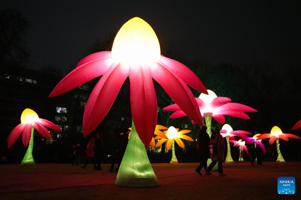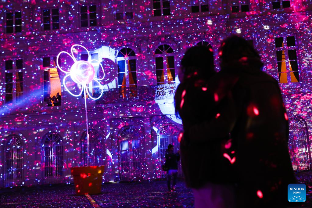 People watch light installations during the Bright Festival, the Brussels Festival of Light, in Brussels, Belgium, Feb. 16, 2023. Some twenty artistic light installations were set up to decorate the capital of Belgium during the festival, which is to be held from Feb. 16 to 19. (Xinhua/Zheng Huansong)