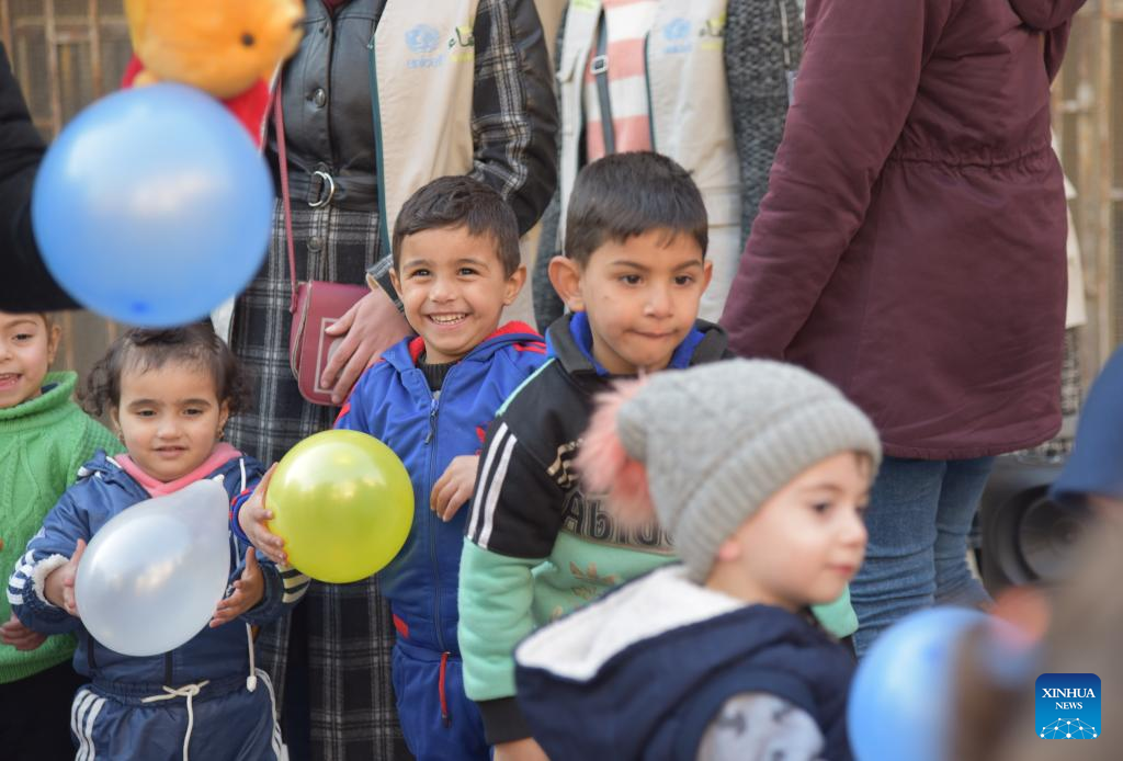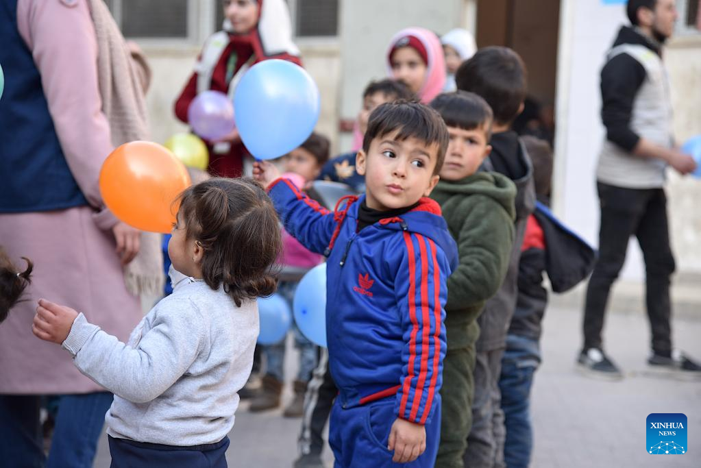 Children take part in fun activities at a shelter in Aleppo city, northern Syria, Feb. 13, 2023. The powerful earthquake that jolted large areas along the Turkish-Syrian border did not only bring destruction and death to Syria's northern city of Aleppo, but also inflicted an indelible trauma on the survivors, especially the children. (Photo by Hummam Sheikh Ali/Xinhua)