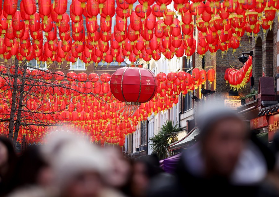 People visit the lantern-decorated Chinatown in London, Britain, Jan. 20, 2023. (Xinhua/Li Ying)