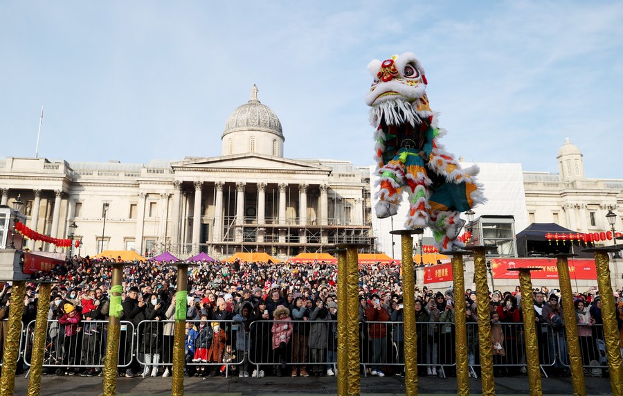 Lion dance performers perform on poles during the Chinese New Year celebration at Trafalgar Square in London, Britain, Jan. 22, 2023. (Xinhua/Li Ying)