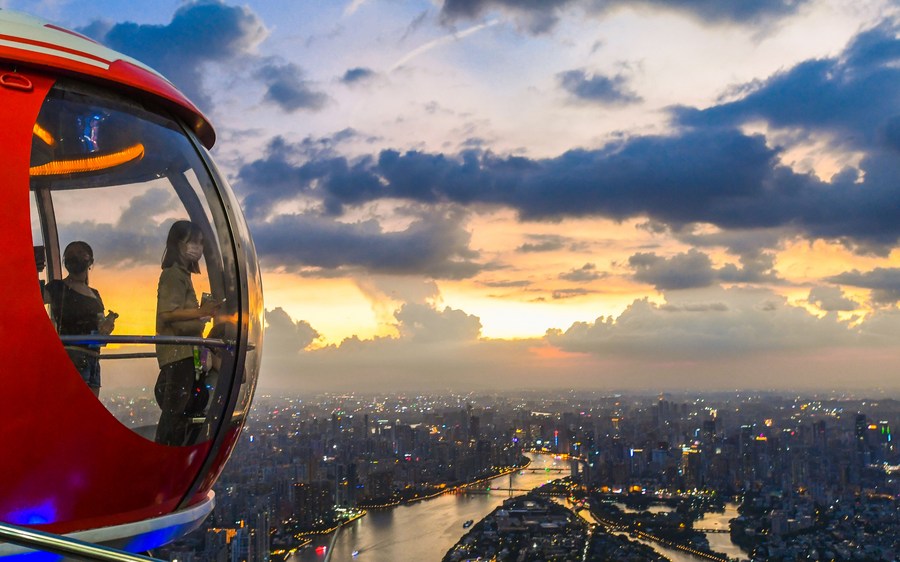 Tourists ride a ferris wheel at the top of the Canton Tower, a landmark in Guangzhou, south China's Guangdong Province, Aug. 7, 2022. (Xinhua/Liu Dawei)