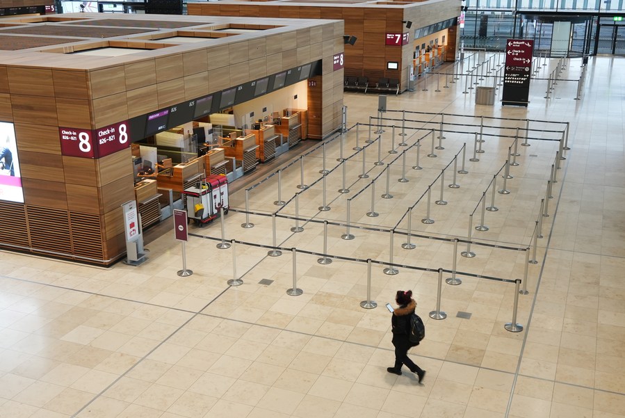A woman walks in a terminal of Berlin Brandenburg Airport in Schoenefeld, Germany, Jan. 25, 2023. (Photo by Stefan Zeitz/Xinhua)