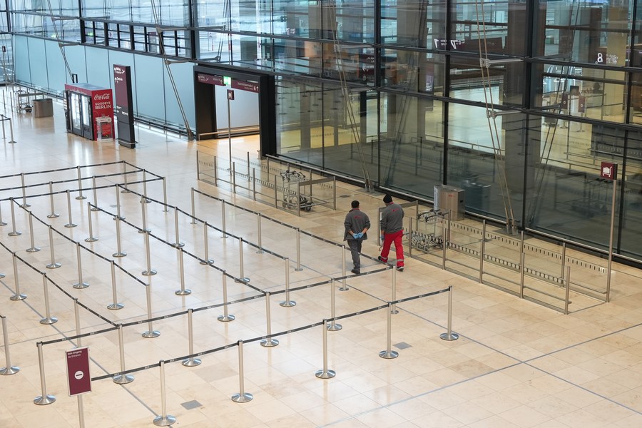 Staff members walk in a terminal of Berlin Brandenburg Airport in Schoenefeld, Germany, Jan. 25, 2023. (Photo by Stefan Zeitz/Xinhua)■