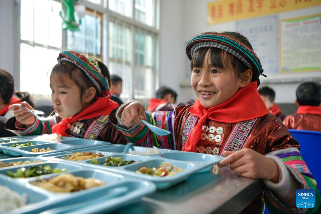 Students have free lunch at the Zhongzhai education spot in Xishan Town of Congjiang County, Qiandongnan Miao and Dong Autonomous Prefecture, southwest China's Guizhou Province, Feb. 16, 2023. Zhongzhai education spot, located in the remote mountainous area of Guizhou Province, has only one teacher and 16 students of Yao ethnic group. In recent years, the conditions of this "mini primary school" have been greatly improved with the help of local government and community. (Xinhua/Yang Wenbin)