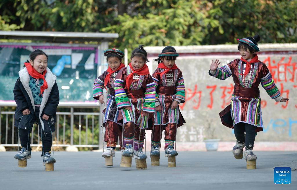 Students take part in a stilts match at the Zhongzhai education spot in Xishan Town of Congjiang County, Qiandongnan Miao and Dong Autonomous Prefecture, southwest China's Guizhou Province, Feb. 16, 2023. Zhongzhai education spot, located in the remote mountainous area of Guizhou Province, has only one teacher and 16 students of Yao ethnic group. In recent years, the conditions of this "mini primary school" have been greatly improved with the help of local government and community. (Xinhua/Yang Wenbin)